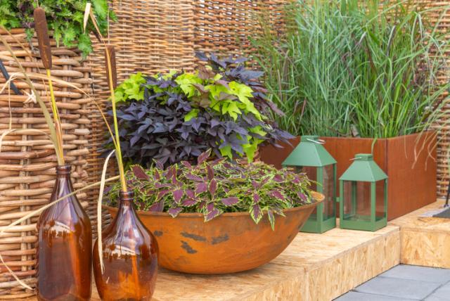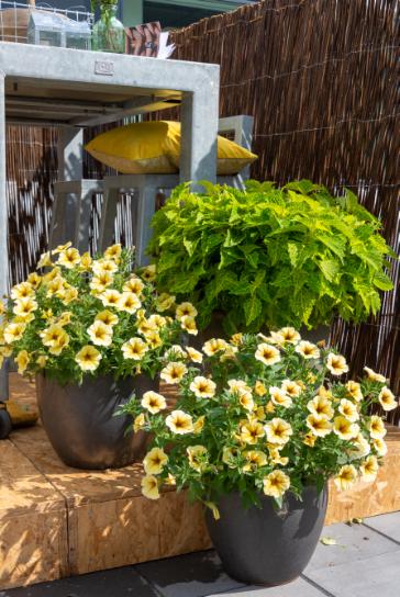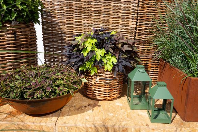 Confetti Garden Camouflage is a combination of three different Ipomoea, which work well in pots and haning flowerpots.
